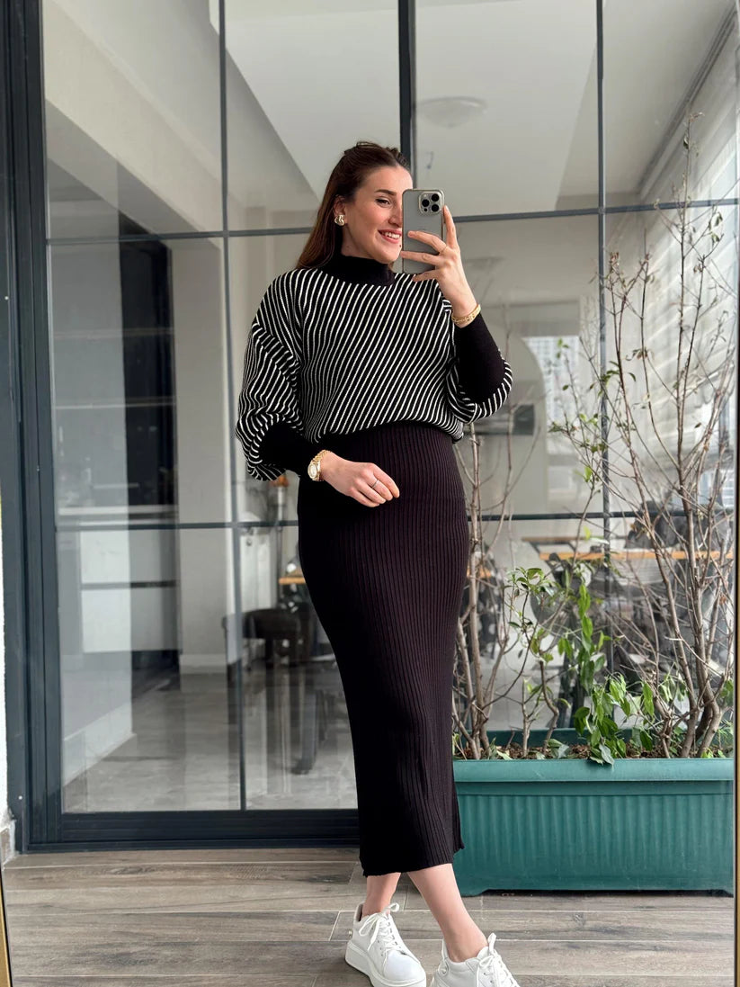 CH 497 beaswear Stripes Printed Stretchable Ribbed Fleece Dress