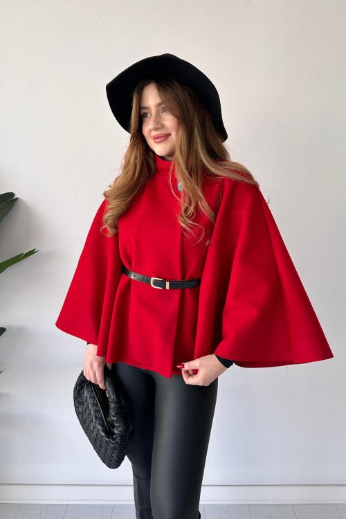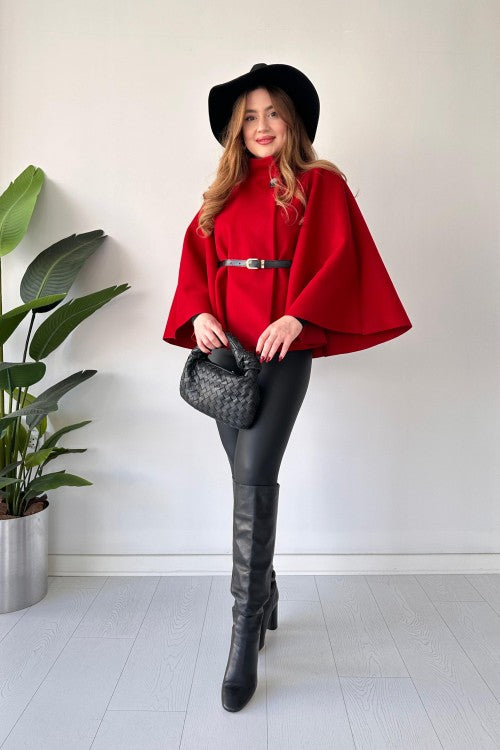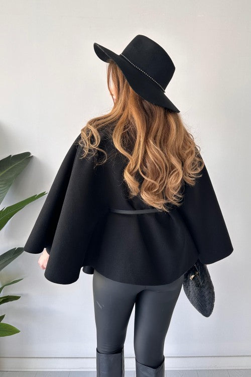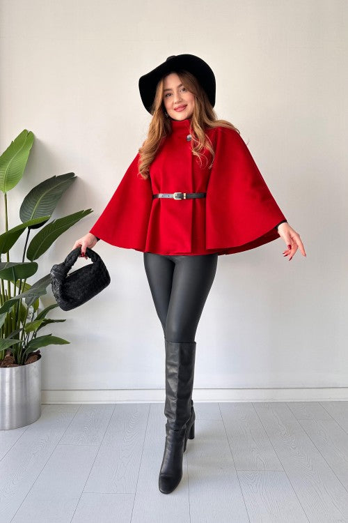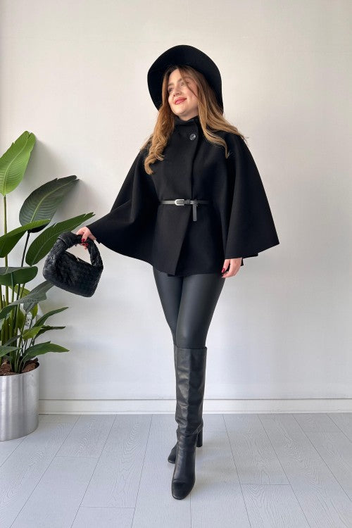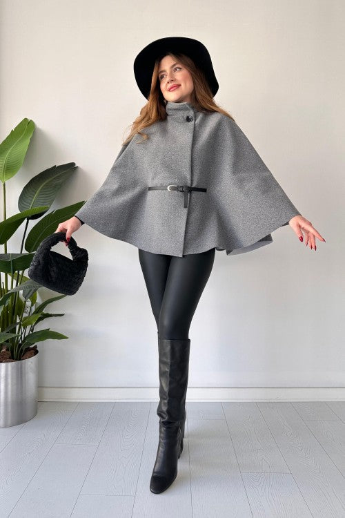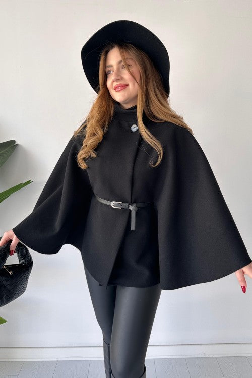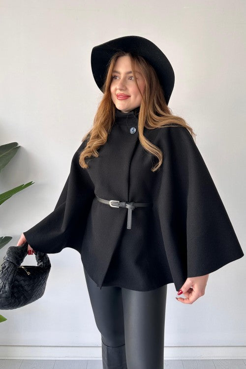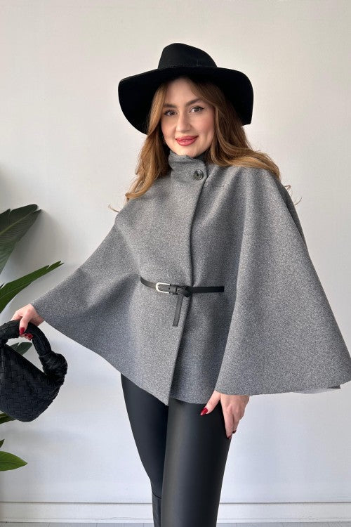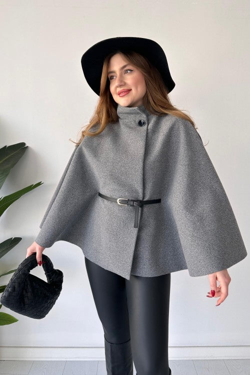 This short cap shawl features a unique new design and includes a belt for added style. Stay warm and trendy with this versatile and fashionable piece. Perfect for any occasion, it's a must-have for your wardrobe.