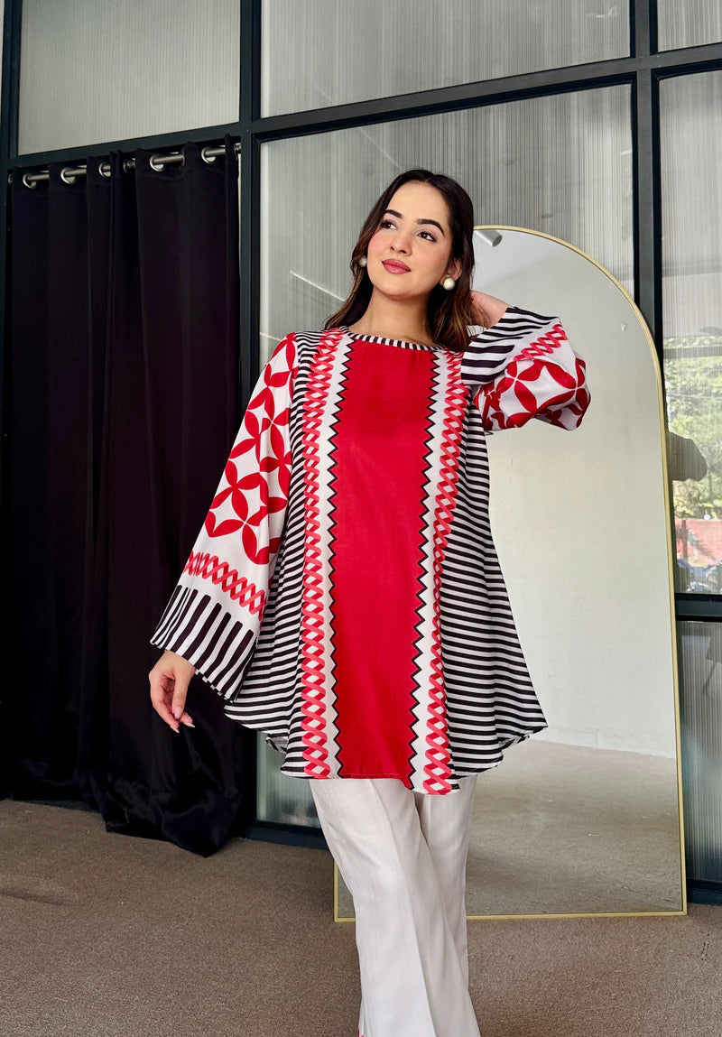 Red and White Fusion Silk Printed Co ord Set (D-14)