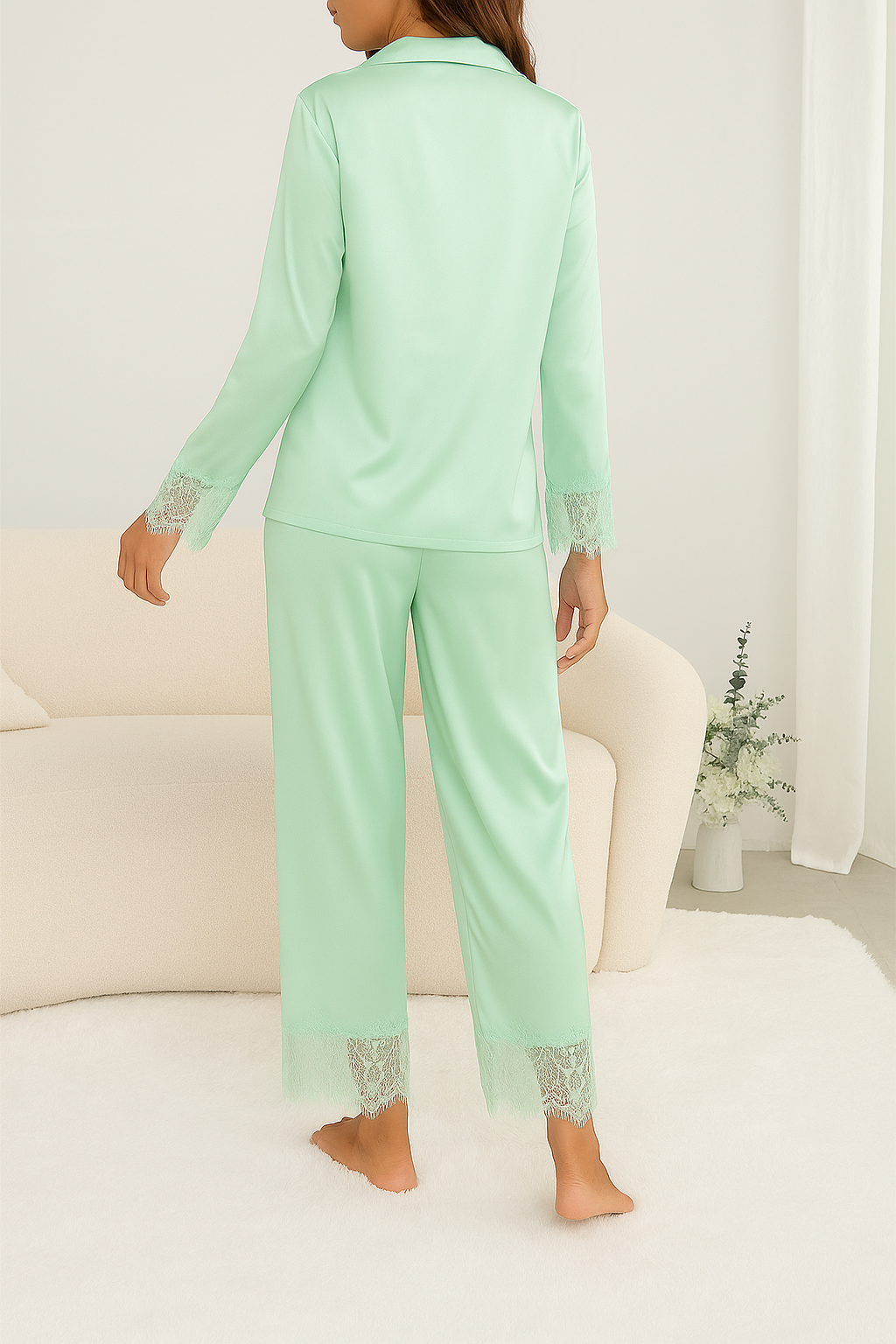Slip into luxury with the BEAS Midnight Muse Satin Lounge Set – a perfect blend of comfort and charm. Crafted from smooth satin, this two-piece set features a button-down top and wide-leg trousers, both elegantly finished with delicate lace trims on the cuffs and hems.