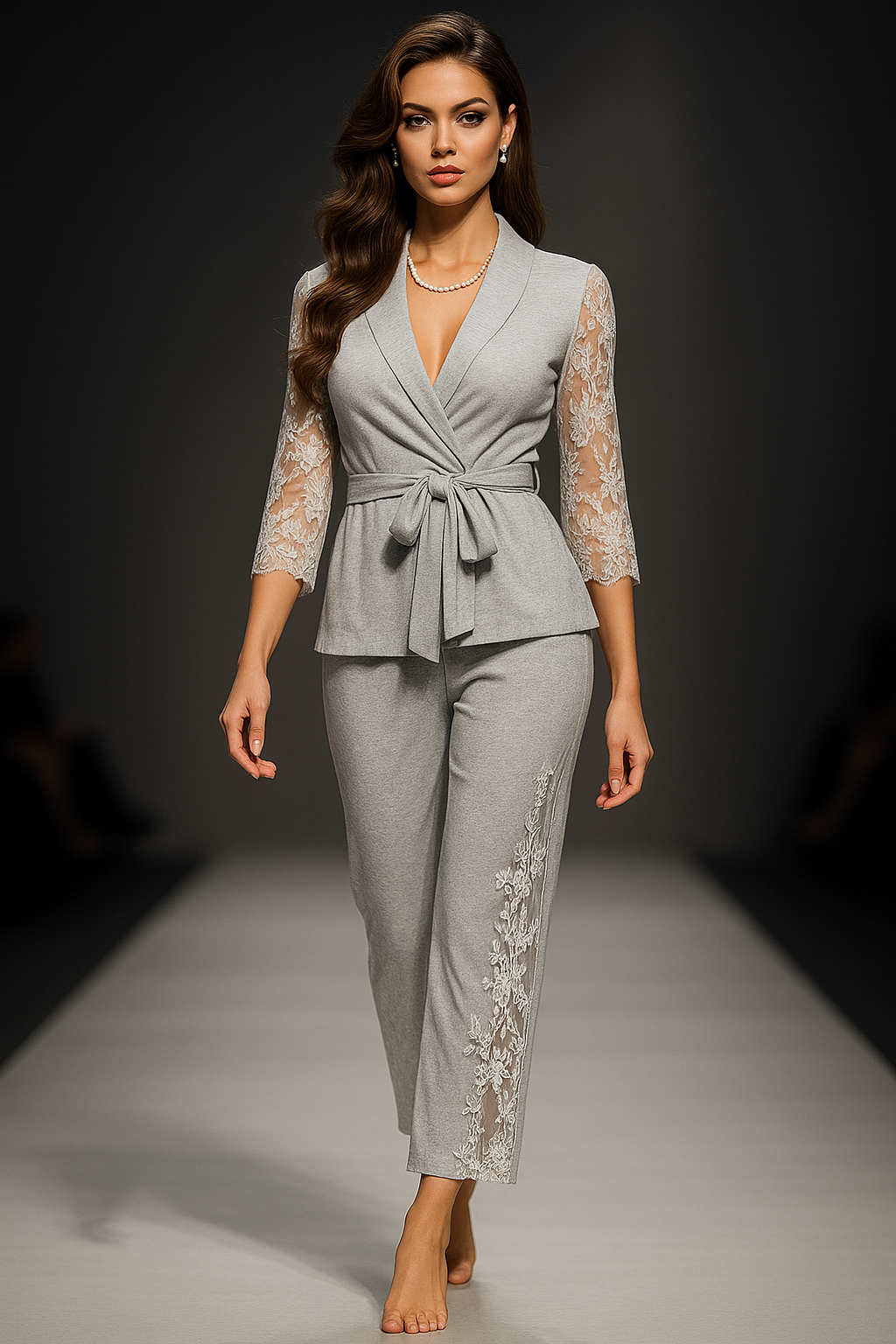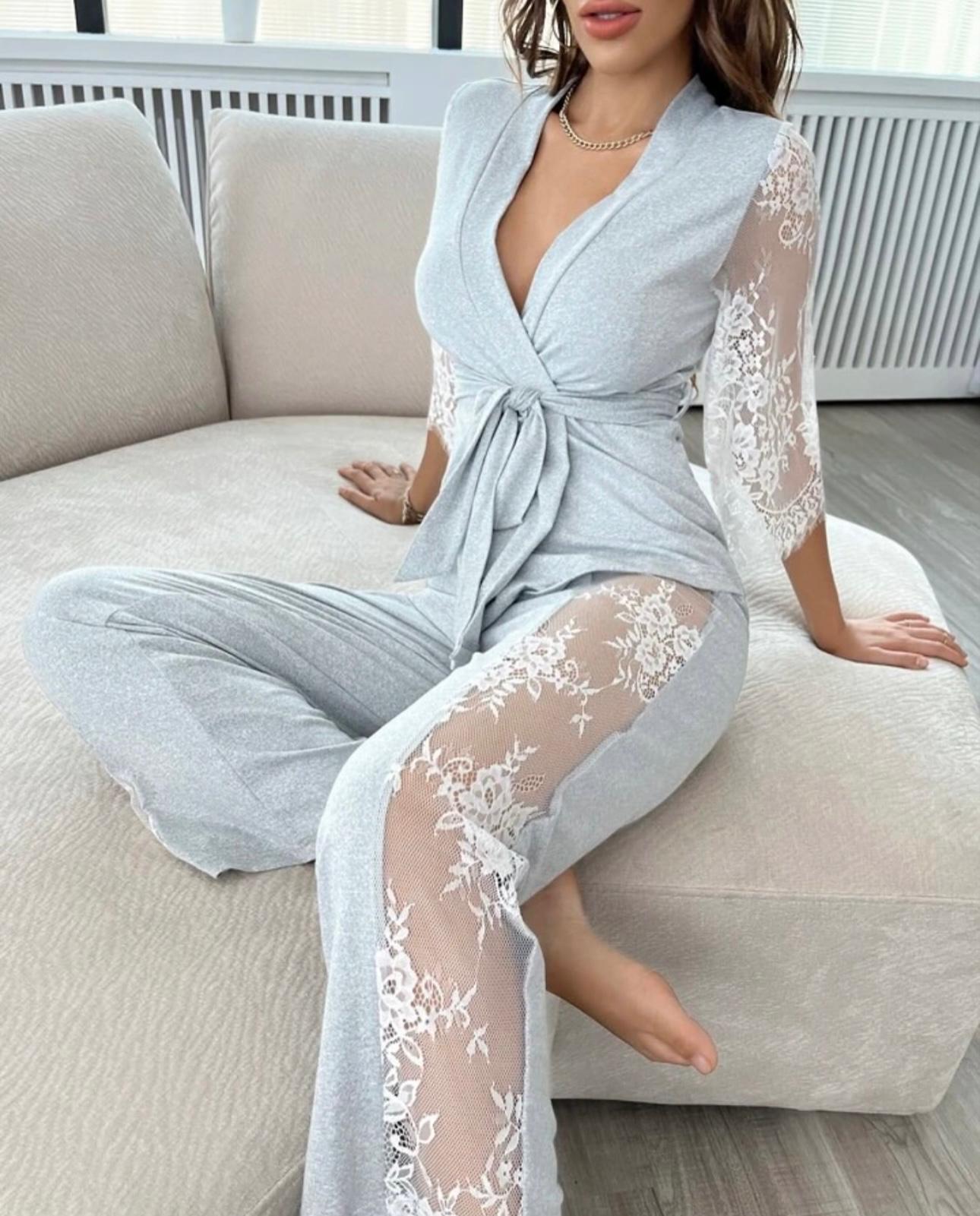 Perfect for lounging in luxury or hosting in style, the soft fabric hugs you gently while the intricate lace adds a touch of glamour to your every move.