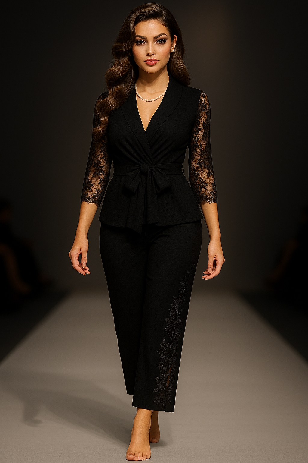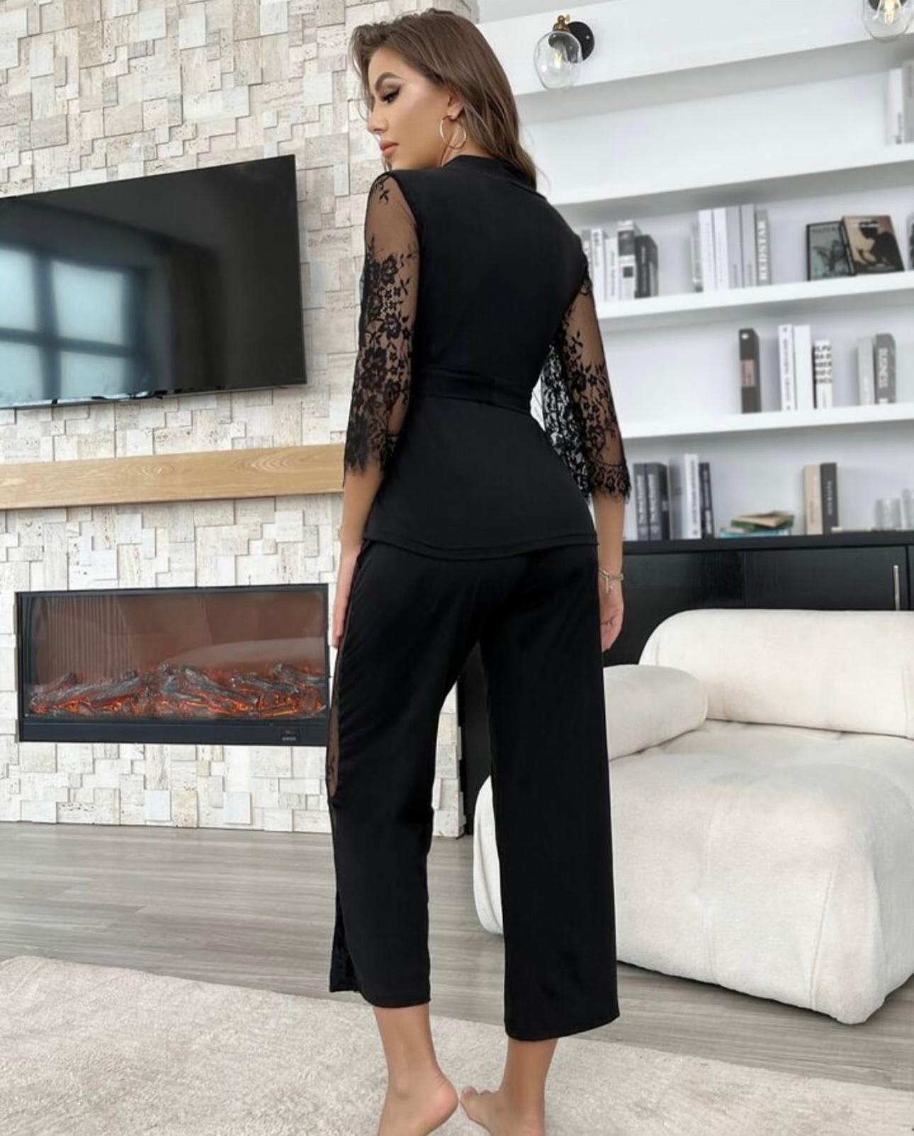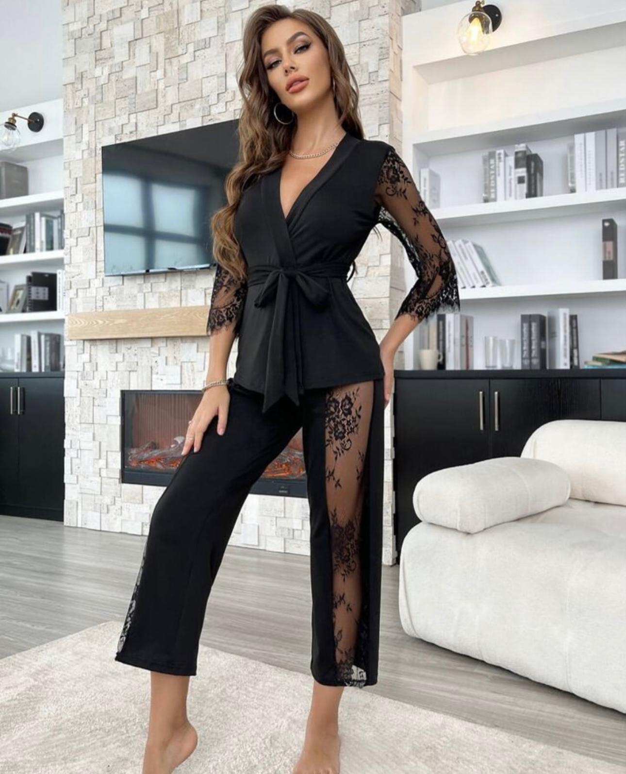 Step into effortless elegance with the BEAS Lace Whisper 2-Piece Set – where sophistication meets comfort. This chic ensemble features a flattering wrap-style top with delicate lace sleeves, paired with matching wide-leg pants adorned with floral lace panels.