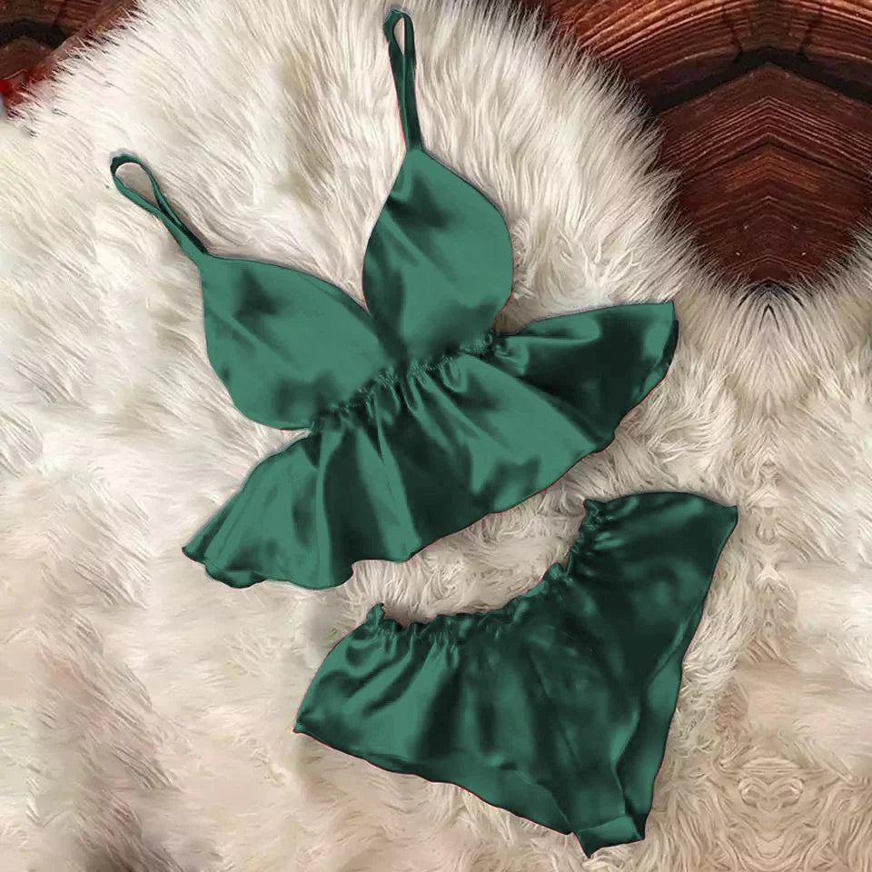 Women V-Neck Eyelash Lace Sexy Stain Camisole Pajamas Bow knot Shorts Set
